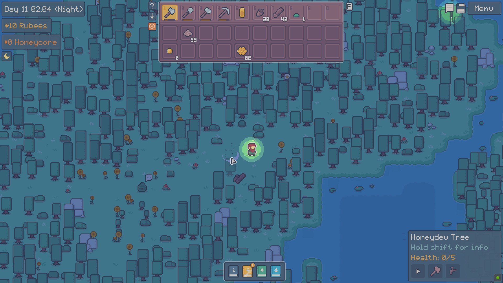 The pixel graphics make the game looks adorable; lush colors flood the screen. Little tiny bees come and go from their hives to pollinate the surroundings flowers, and little heart emotes populate the screen. It’s all super cute, I enjoy it.