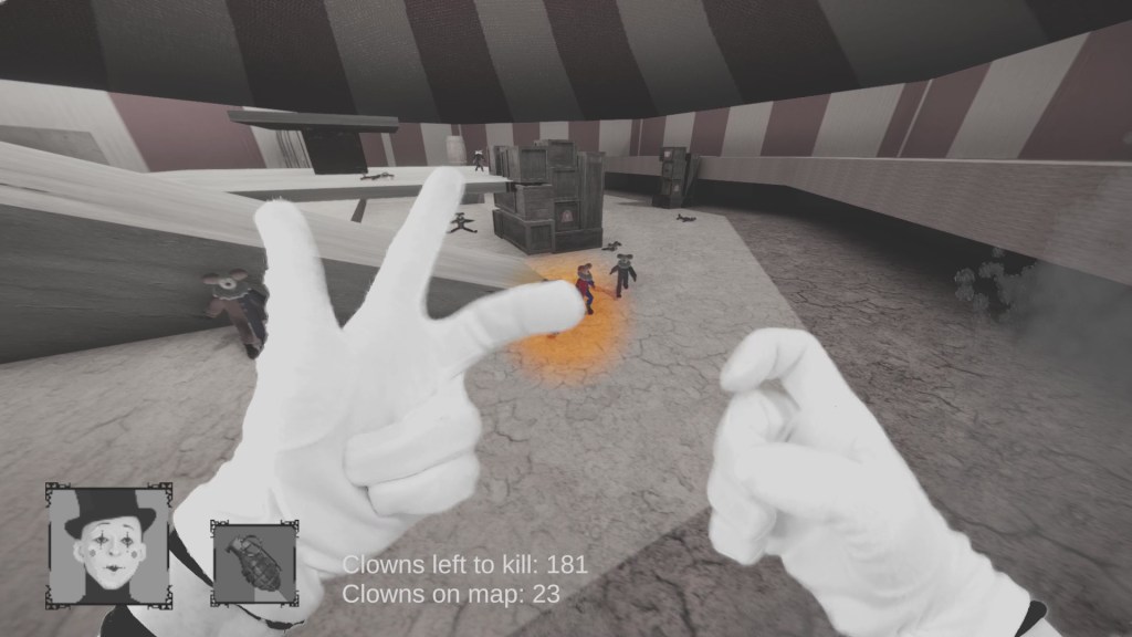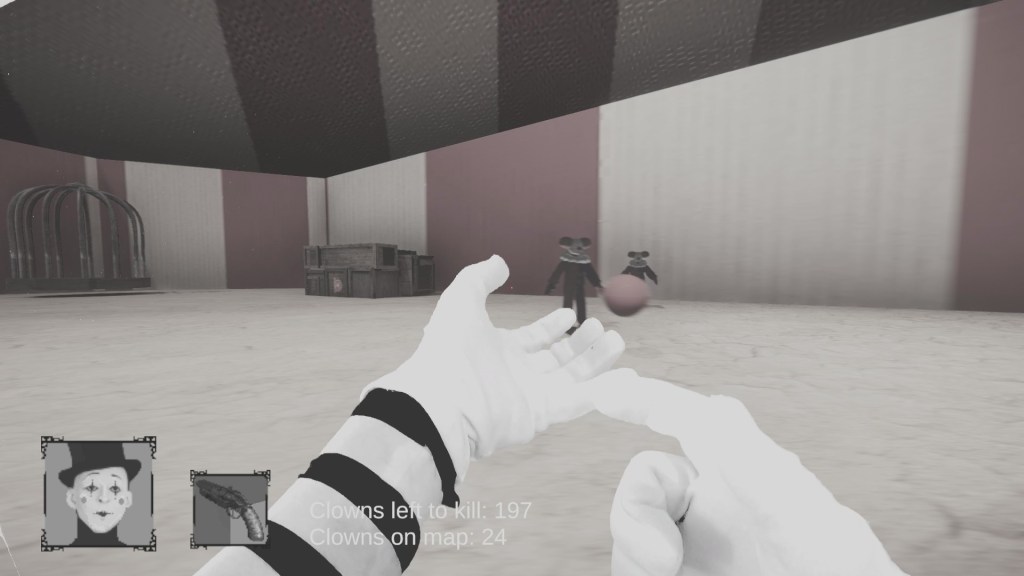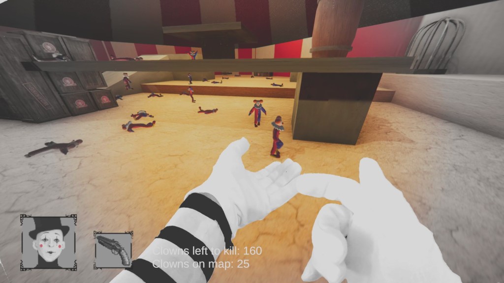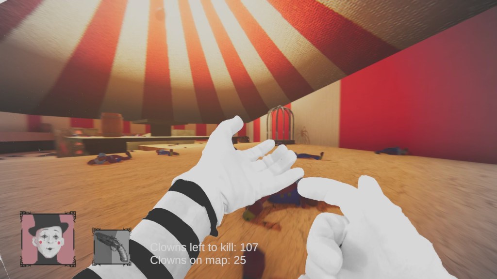 The game looks decent enough for me. The UI at the bottom of the screen has a mime face, the weapon that is currently equipped, and clowns left to murder.