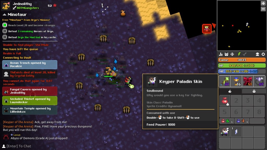 I fondly remember playing RotMG on a real shitty desktop PC, and with that, a real shitty internet connection. At the time there was only a handful of endgame dungeons: Tomb of the Ancients and Oryx’s Winecellar. With the weapons and the abilities at the time, these dungeons were some of the scariest things on the planet. Other dungeons were not far behind in terms of intimidation. The Abyss of Demons was another dungeon where I lost plenty of characters. As time went on and RotMG exchanged hands from Kabam to DECA, the game began to evolve in more ways than one.