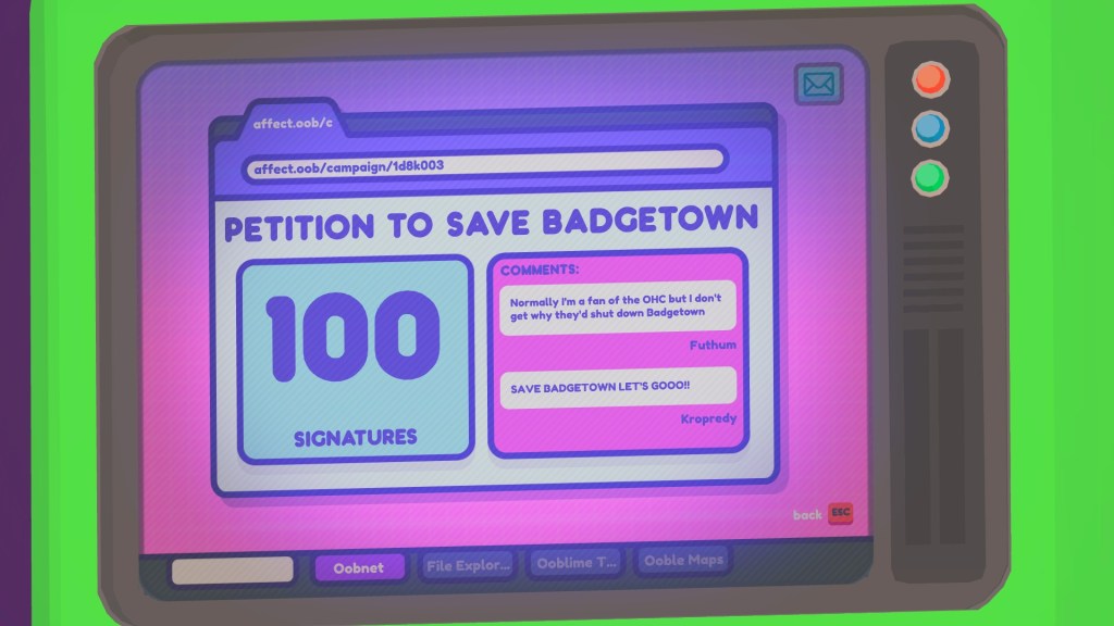 The story of Ooblets has been shaped quite well. The overarching objective has been to activate the Oobnet towers to save the city of Badgetown. Blank has incorporated a government cover-up to the story that really wraps up Ooblets in a nice, comedic little bow. I enjoy the Ooblets story not because it is serious, but because it works so well within the world that it is told. The Ooblet High Council hates Badgetown and it is up to you, and only you to figure out why.