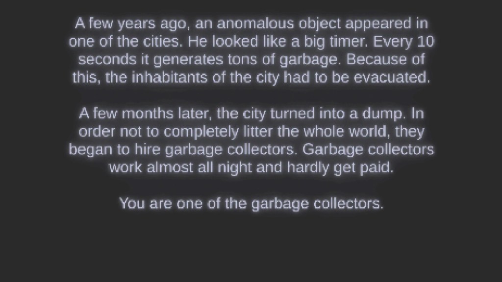 A city used to be here until humans amassed so much trash that they abandoned the city and hired garbage collectors to clean up the infinitely collecting garbage piles. The garbage spawns every ten seconds and just appears out of thin air. After some time you are visited by a stranger that informs you that there is a way to escape your fate but it requires sneaking past “the guards.” A harrowing tale about taking a train to escape your new job.