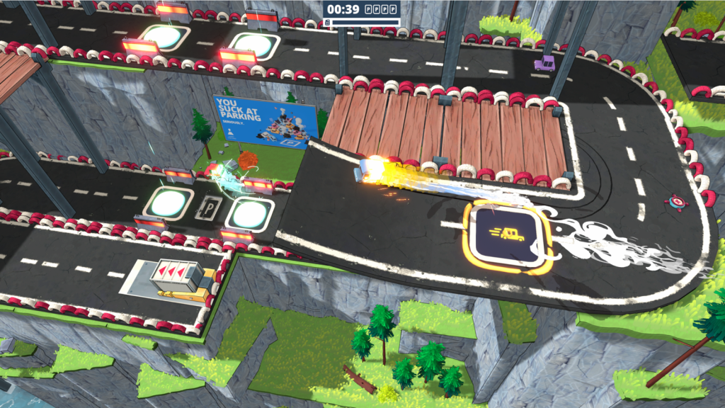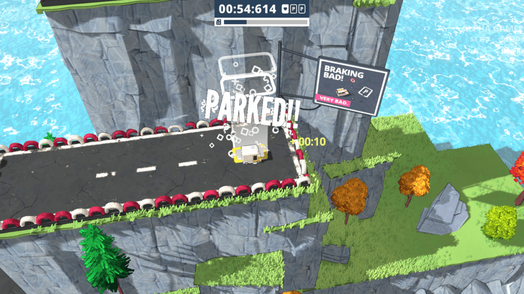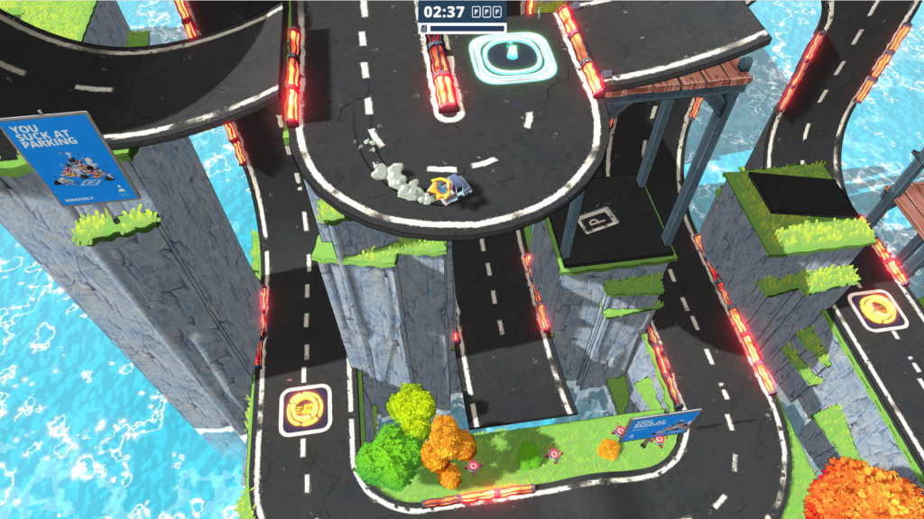 There is an overworld that the player can drive around in with levels that introduce a new mechanic and still to a specific theme. In terms of the single-player, there is a bunch of content, like 7-9 hours of content. There is a multiplayer mode attached as well. It is kinda fun when you mash a bunch of people into a simple game mode and expect them to park without error before everyone else.