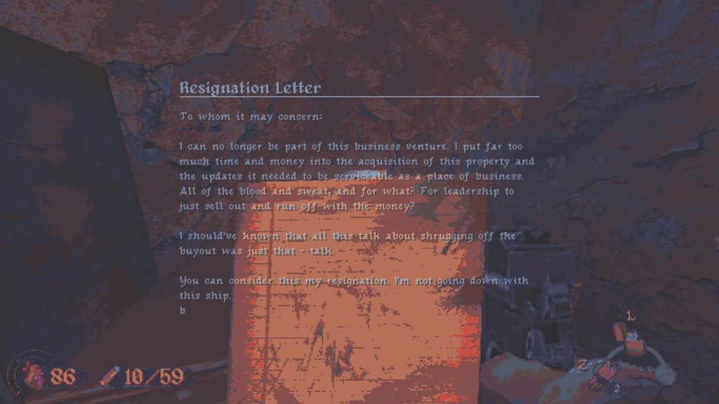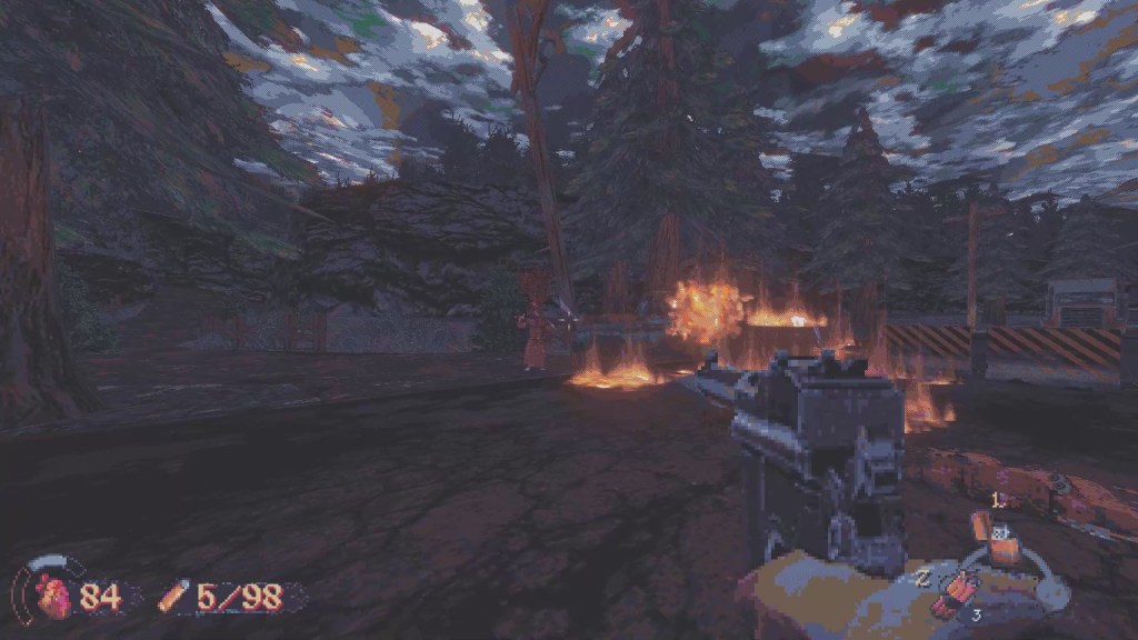 Cultic has a really unique look to it. It really takes from those old-school video games like Duke Nukem and Doom. The animations are actually really good and it is really satisfying when guns are reloaded. The game is pixelated enough so that it can look like a retro game and it looks good enough so that environmental storytelling is legible.