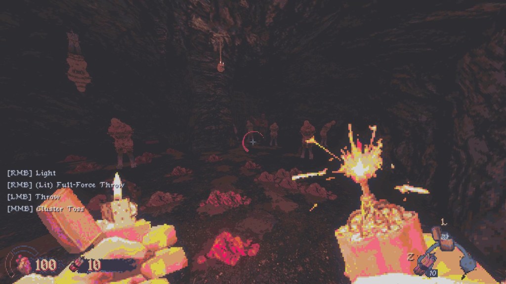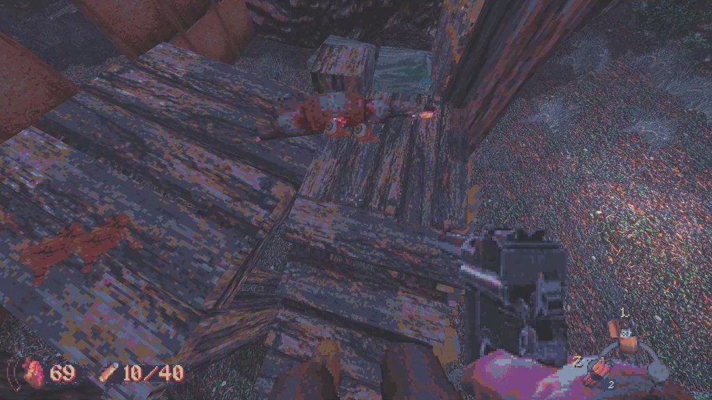 The shooting is also really good. Enemies throw axes, shoot guns and sometimes throw molotovs, so being quick and accurate is key to winning fights. Lots of enemies are out and about and it is easy to get caught up and die, and firefights can get quite intense which makes for a really good feeling when you come out just barely alive. The sound of a headshot in Cultic is top tier and looking at the ground to see that their eyeballs are looking right at me is just blissfully horrifying.