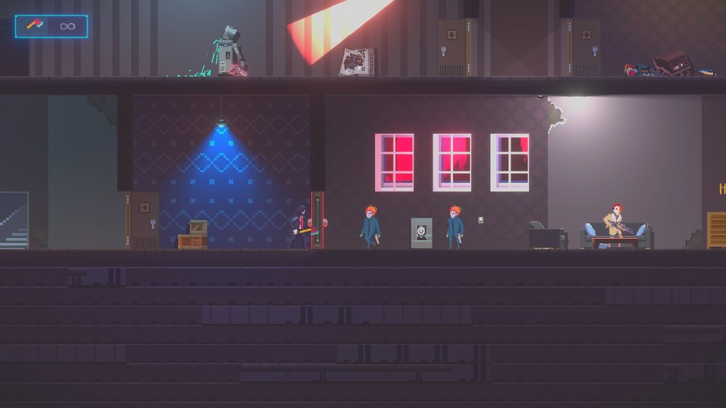 Each of the levels kind of blends together, but regardless they are fun. Each level has you go in and usually tasks you with assassinating everyone in the area and then prompted to leave. When taken into consideration, each level is its own puzzle that needs the player to die a few times to fully realize the sequence and the discretion needed to complete the level with an S rank. Bad guys with guns, knives, automatic rifles, and even security cameras litter the area ready to alert those baddies to your position. I really like that the demo also ramped up the difficulty a little to give me a nice pace for when I was trucking through the first two levels and then was stopped dead because the level design had changed dramatically.
