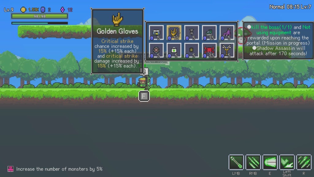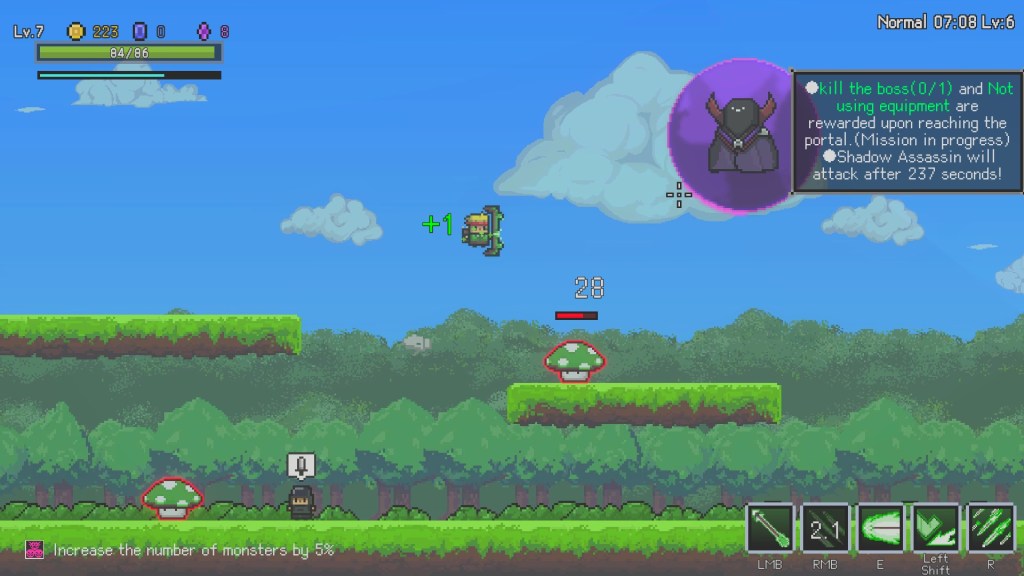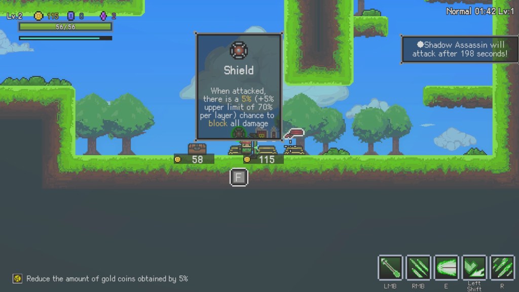 Inside each dungeon is your typical rogue-lite action. You got your bad guys: Mushrooms, spiders, rock monsters, and flying bad guys. Loot their corpse and take their coin, send that coin on upgrades via chests or an option to choose one of three. After a certain time limit an assassin shows up and can just end the run.