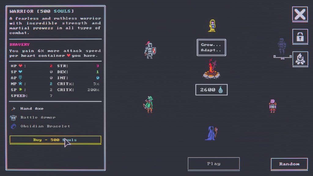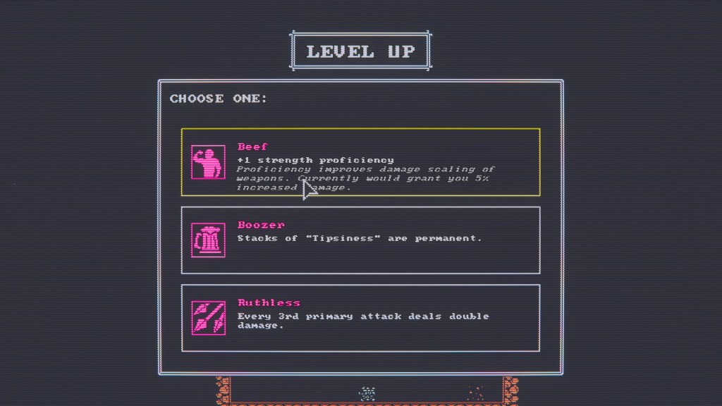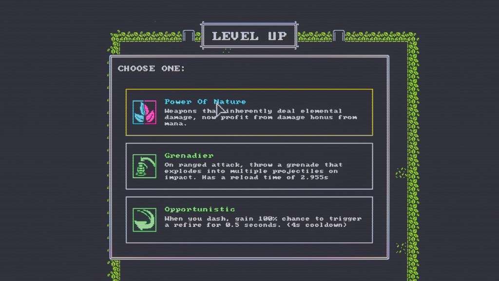 Before we talk about the combat I am going to talk about LITERALLY everything else. Each character specializes in a specific attribute, whether it be dexterity, intelligence, or strength. Dexterity increases the rate of fire, intelligence increases mana efficiency and strength increases damage. After a certain amount of attribute pickups, the player levels up. When The player levels up they can choose between three class-specific upgrades. Ranger gets a critical hit chance, the wizard gets increased mana, the warrior gets increased damage, etc. Each character has their own passive perk that is exclusive to them. It is all very simple but the potential for power fantasy builds is very possible, which I like, a lot.