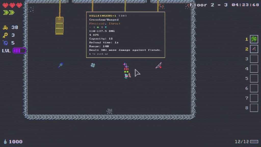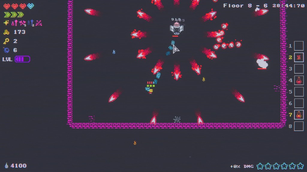 There is Borderlands level of weapons in Tiny Rogues. Noted above I have played just under six hours and I have yet to see a duplicate weapon. I’ve seen Excalibur, a bow that shoots exploding chicken eggs, and a staff that shoots bombs that blow up the entire room. Lots of basic weapons and a few fun weapons to keep the fun going.