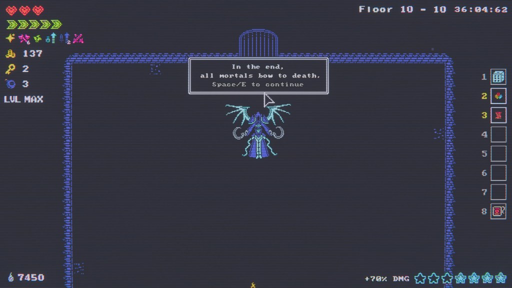 Tiny Rogues has that crt tv screen thing going on, which tries to justify the simple and devoid of color in the art design. Black dominates the screen while small outlines of color signal to the player which dungeon they are currently in. The enemy design is something else entirely. I am pretty sure that the iron maiden from Enter the Gungeon is in this game. Lots of small visual easter eggs are what make Tiny Rogues‘ visual design go over the top.