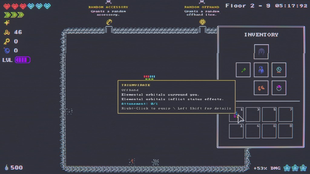 The RPG elements come in the form of stats from clothing picked up while playing. Primary, off-hand, helmet, ring, boots, etc, can all be picked up throughout the runs. Usually, clothing comes from locked chests or rooms that specify a clothing item. Clothing gives, mostly, passive buffs, for instance, being able to dodge the first hit in every room or a chance to duplicate a shot. There were times when I was completely and uttering impossible to kill because of the asinine clothing items that my character was wearing.