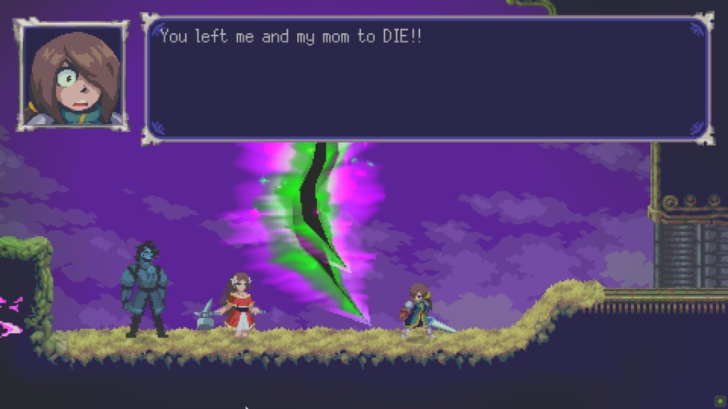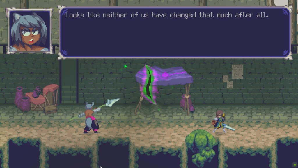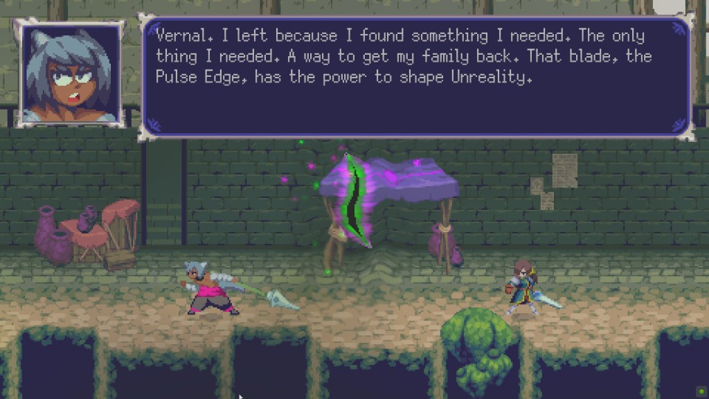 Vernal Edge is really a Metroidvania. You are introduced to the world of Haricot, the villain, his intentions, and the villain’s entourage. You are then told of the magical artifacts that will lead you right to them and it is up to you to find them through backtracking and pure frustration of being lost and looking for some sort of hint of where to go; a staple of Metroidvanias.