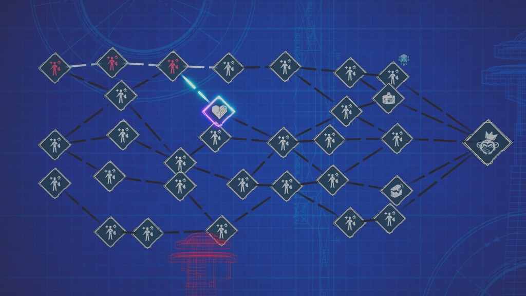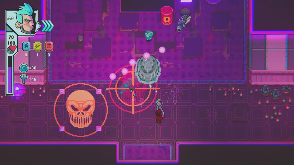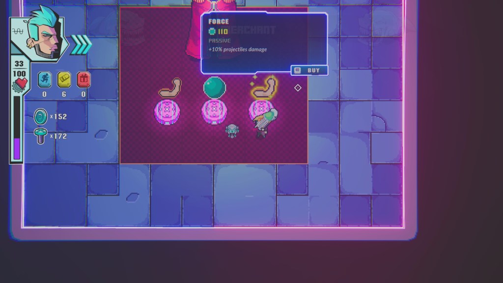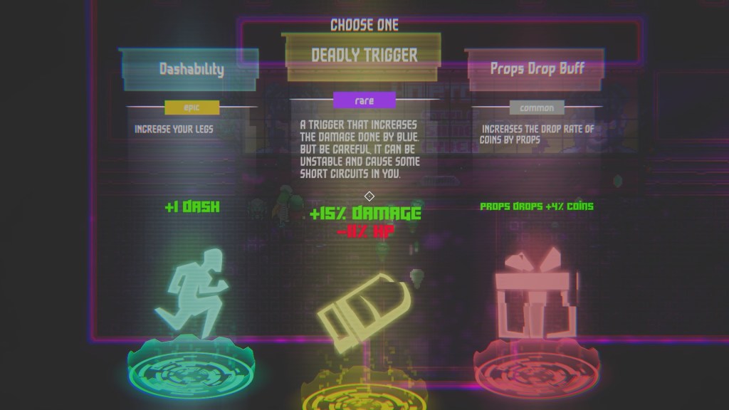 Cyberwar has everything that all rouge likes have, nothing really deviates from the norm here. You enter an arena with some bad guys, shoot em dead, collect one of the three offered perks, and move on until the boss shows up, rinse and repeat.