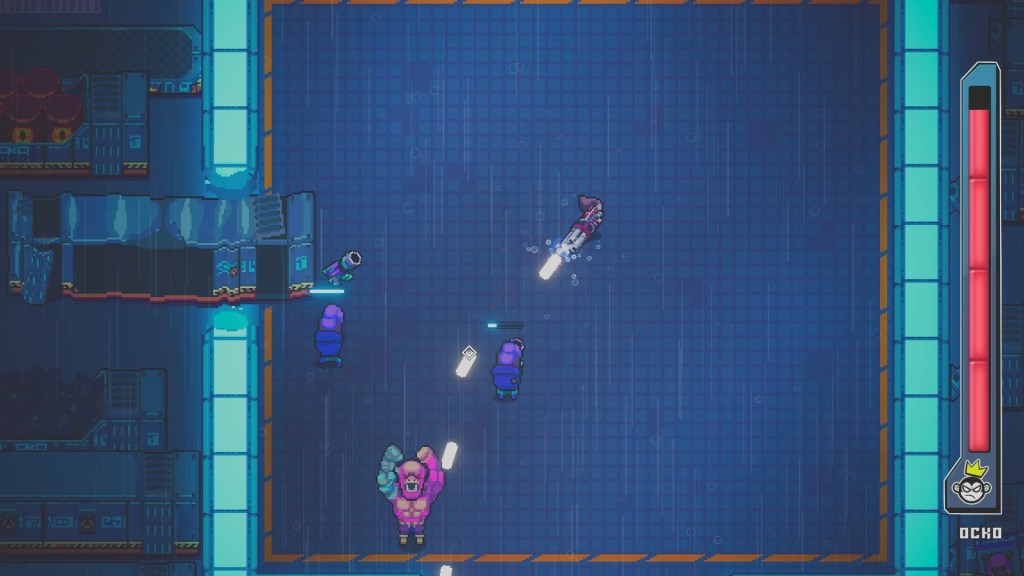 Pixel graphics always get me. The under-city streets are filled with neon street signs that light the way to the upgrading and fighting. Humans are not the only species run out of their homes by the monkey uprising. Octopi, robots, and other animals are present at the end of the world. It is truly a gorgeous-looking demo.