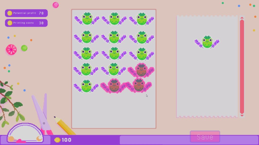 Make stickers, print stickers, pack stickers and make money. Use that money to buy sticker templates on the internet and upgrades to your business. In the Sticky Business demo, the player gets a small tease of what the full game will have. You have the ability to choose from a wide range of stickers to create whatever your heart desires and name the product that you have made. You are then able to print said sheets and promptly fill orders as they come in.