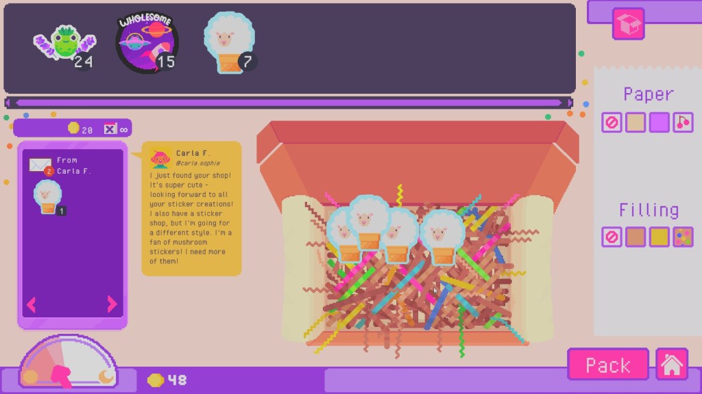 Packing stickers is a fun minigame within the game itself. You have a separate screen that has options for what color of base tissue paper to use and what kind of packing filler to use. It’s a nice touch that allows for a more personal aspect for the player.
