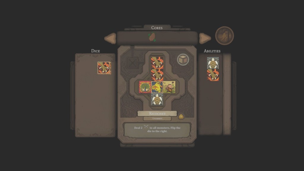 Throw the dice into the designated area; both at once or one at a time, and sling spells. As the player moves on and gets a hang of how the dice work, the game introduces every other mechanic all at once. When successful in battle the player is offered a choice of three new dice facings. Options may include a damage modifier, a status effect enabler, or an ability that takes advantage of multiple bounces. Note that a majority of dice facings rotate the die onto another side as well, making for potential combos. Once taken, the player can fully customize their die in whatever fashion they desire.