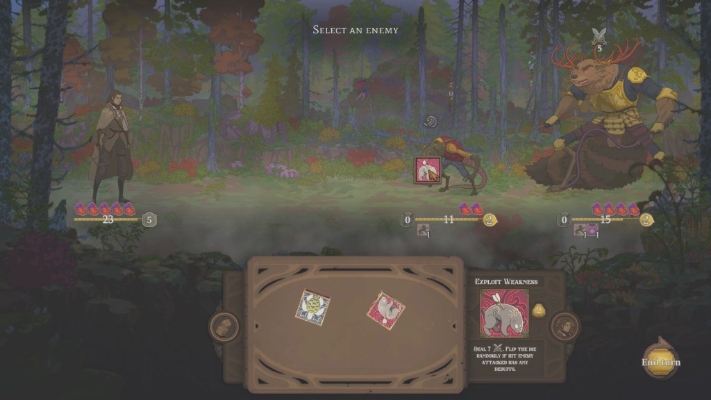 Tamarak Trail’s UI really reminds me of a lot of games like Darkest Dungeon; from the player and enemy placement on the screen to the status effects, it is all really DnD inspired. The game is also very pleasant to look at from the perspective of enjoying the look of eldritch monsters. The animations are kind of stiff when attacking but it’s the demo, who cares.