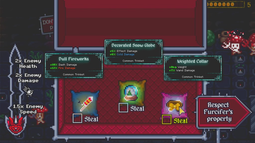 Furcifer’s Fungeon is a nice take on Vampire Survivors with more of a player role than just timed shots with heavy player movement. Furcifer’s Fungeon forces the player to choose one of three starting characters, use the mouse to hit the shot to kill the bad guys, and collect their coins to level up. When the player levels up you get all the confetti and praise that you played the game and have a choice of three individual talents and a specific attribute to raise, either it health, magic damage, luck, etc. Unique talents may be a timed lighting bolt that deals extra damage, a hammer that flies around the screen, or even additional damage to specific elemental damage (fire, ice, electric). The combat is fun because there is a primary fire and a super sweet unique ability that stops you dead in your tracks to charge up and get hit almost every time.