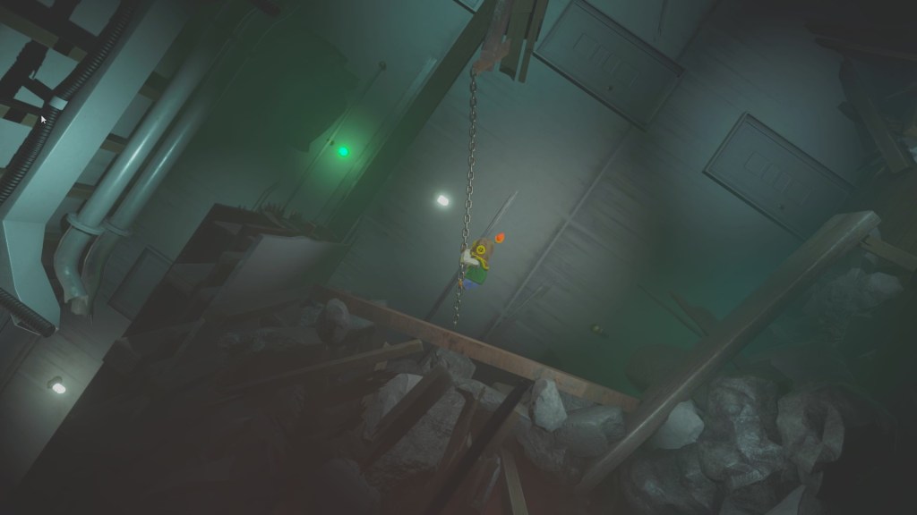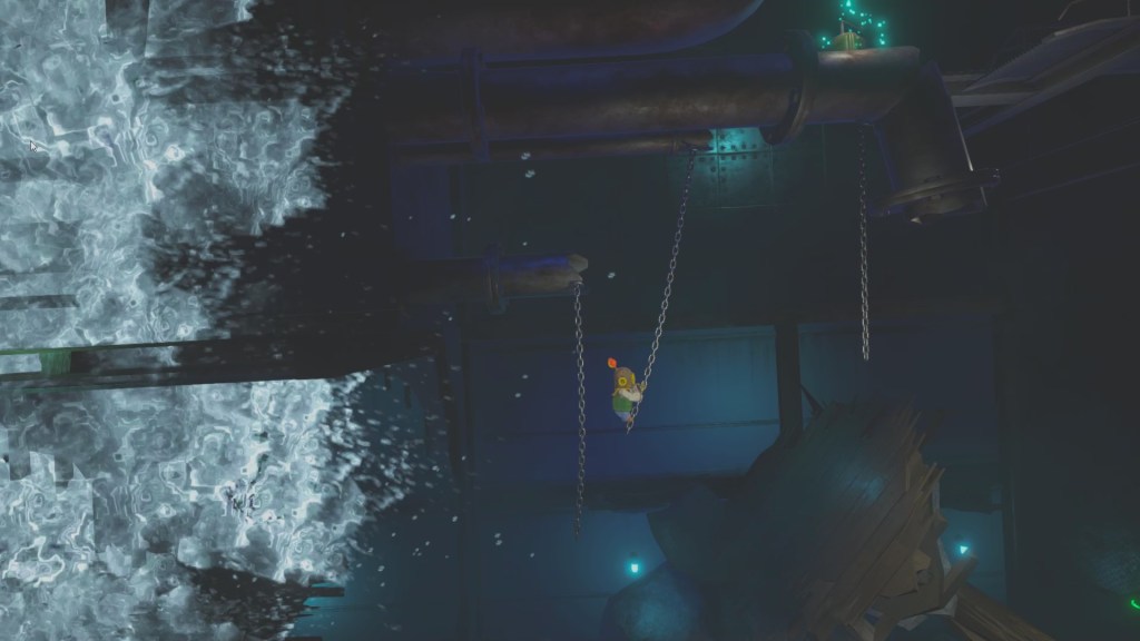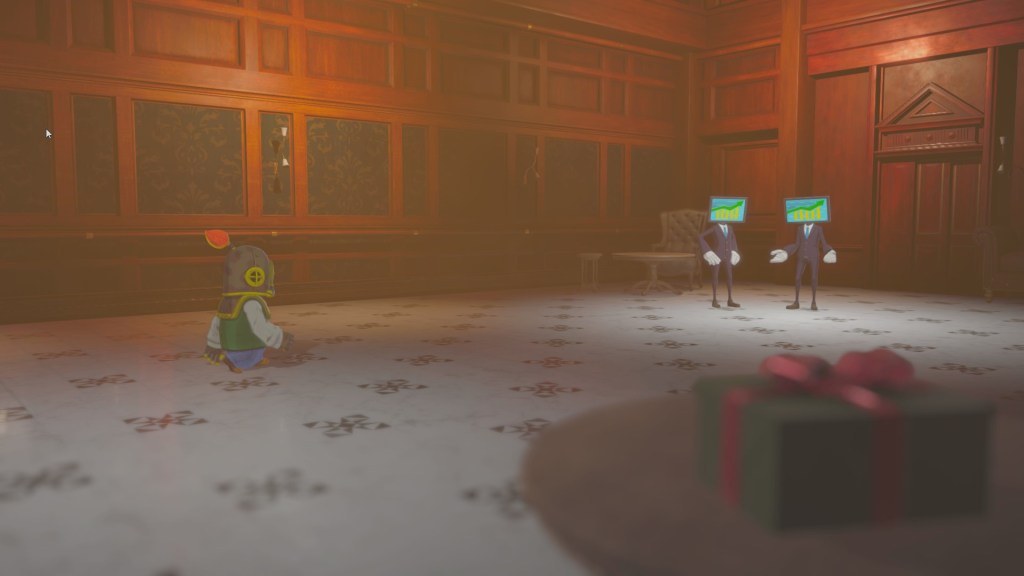 Gift reminds me a lot of Little Nightmares, being a side-scrolling platformer with a 3D background, loud, scary sounds, and a non-verbal protagonist. The gameplay of Gift sets itself apart through the constantly changing orientation of the ship as the player progresses through the game. The cruise liner is the enemy and it is out to get you. Platforming is pretty much the only gameplay; it is the only thing that you do. Diver Man can jump, jump higher depending on how long the button is held and he can interact with the various people on the liner. Gimmicks begin to arise when the water levels rise and lower, like chase scenes and insta-kill sections.
