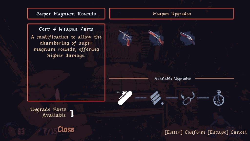 A pistol, a double-barrelled shotgun, a grenade launcher, dynamite, a sniper, and so much more are available to the player. The shooting is crisp and clean. Hit enough shots in the head and the most satisfying crunch/splat sound comes afterward. There are upgrade stations where you can make guns reload faster and deal more damage, and finding secrets is the main currency in upgrading.