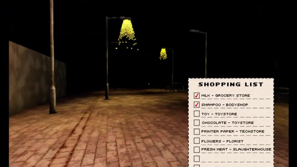The Shopping List is really just a walking simulator with some weird and spooky shit sprinkled in. Walk to each store on the list talk to each of the incredibly awkward townsfolk and learn more about the people who have disappeared. There are even occasional random objects placed around the town to remind you of your shitty life before the move.