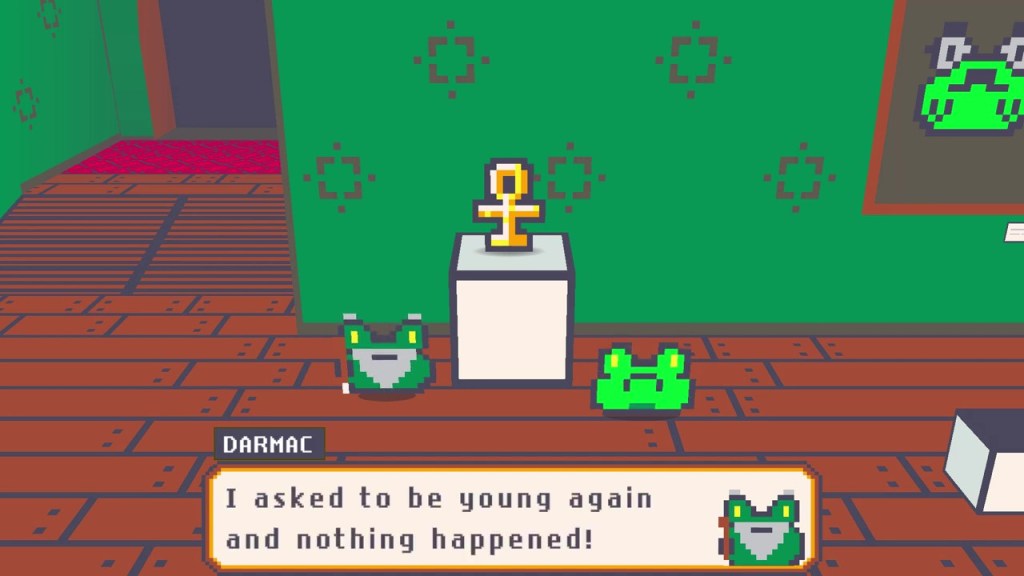 Froggonit is, again, a simple game. You are really only ever talking to folks and exhausting all of their voice lines and moving on to the next one. There is a small taste of the kind of puzzles and combat that will probably unfold in the full game. Locating colored library books to unlock a secret passageway and a simple dodging minigame is what awaits the player in the demo, among other things. Now that everything can be discovered again, much of the gameplay is buried beneath the unknown world.