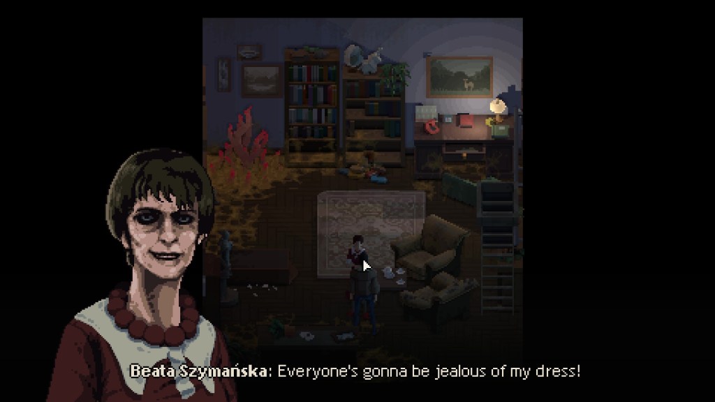 We are here once again on the topic of Pixel graphics. Holstin is clever in its game design. The game is great looking when stationary, but the player can rotate the camera to find hidden paths, and items, or even to help solve puzzles. The game is dark but achieves a really good spooky atmosphere. Blood and gross tentacle shit trails on the player’s feet, the light pierces through the darkness but there is still an eerie sound and a form shifting behind the darkness is even spookier. Talking to characters brings up a portrait of them and man, the people are just gross-looking. Not in a badly design way, but that the story behind everything really brings it all together.