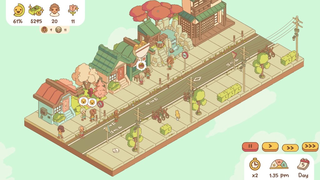 The demo offers a few challenges to the player to maximize the understanding of the deeper systems at play. Why are people happy with your street? Well click on them and see what they have to say about it. There might not be enough beauty to lighten up the dreary city-like atmosphere. Maybe they didn’t like the boba or the ramen shop selection.