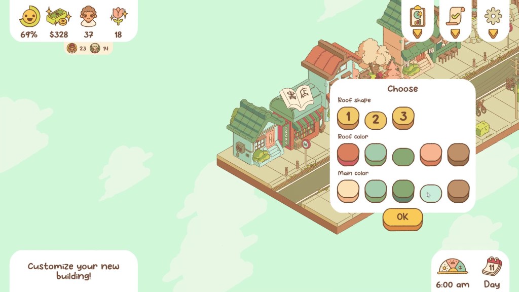 Minami Lane is a nice cozy game to play when you have some time to kill. In-game days are short and can be fast-forwarded. Everything is simplified, from upgrading and customizing to placing structures and accessing the menu. There are times when fast-forwarding through the day is encouraged to save time when finishing up the final task, but, for the most part, letting the day just go by is relaxing enough on its own. Picking up trash for coins, petting cats, and finding the Tanuki are optional but help with passing time while the people do their thing on the street.