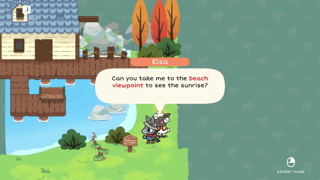 Many of the puzzles require the player to finish one fetch quest to complete another, but some are genuine brain scratchers. For instance, there comes a point where the player needs to wake an animal up from its nap with music, and my first instinct was to grab something that I saw in a previous area, but I was incredibly wrong. There were multiple steps in concluding the “wake the hippo up” ordeal. There were even parts when I was getting frustrated that I wasn’t getting the “lightbulb moment” quickly like the previous puzzles but I then calmed down and just thought outside the box and it worked like a charm. Most of the puzzle solutions are hinted at by the character that the player is talking to. They will say things like “My entire purpose is to break rocks” or “This is designed specifically to destroy bigger rocks.” A Tiny Sticker Tale is very forward with its puzzle solutions.