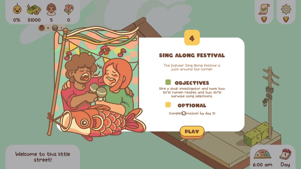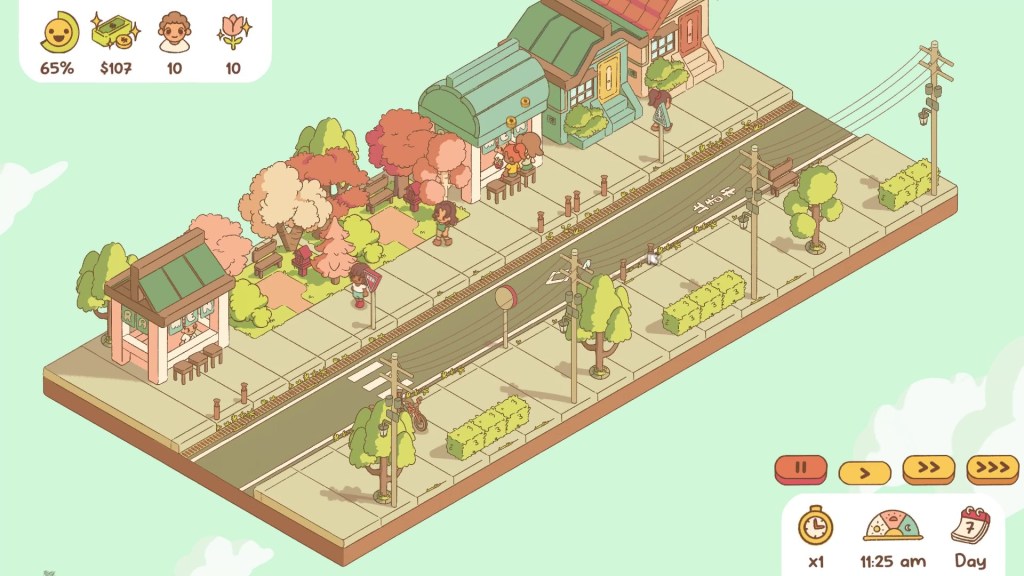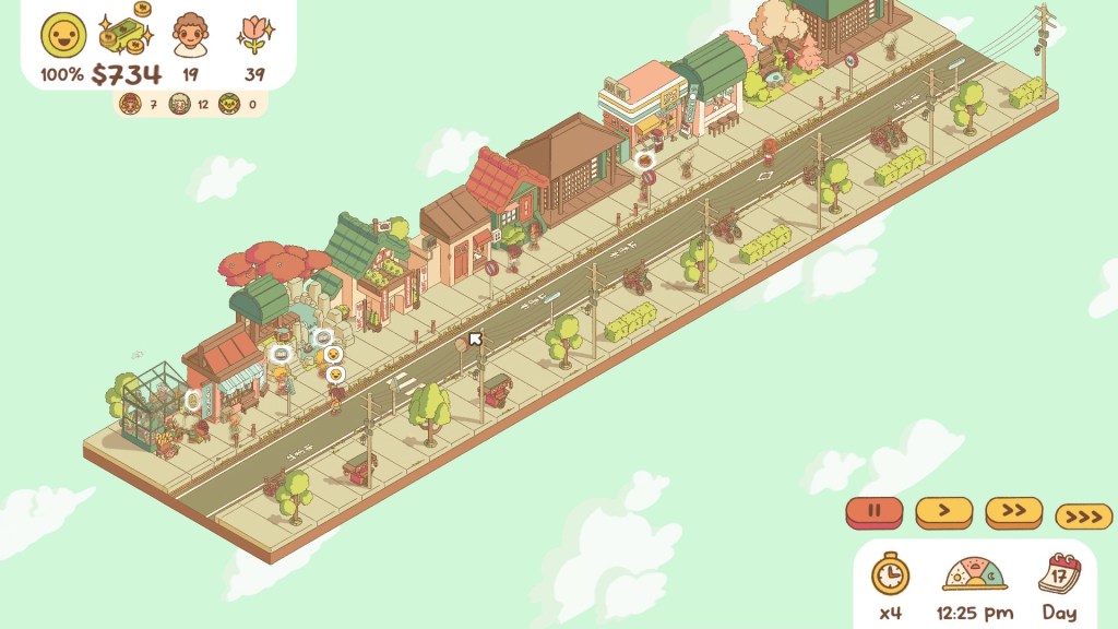 The day then starts right after upgrading/purchasing buildings and it’s cozy from then on. Little people walk up and down the street experiencing the new revitalized street, eating, and taking in the beauty. They will let you know by day end what they liked about the shops whether it be the price, how the product is prepared, what music and what books to stock.