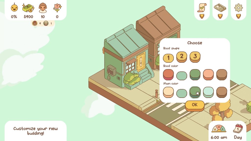 When the game opens up there are a few challenges to complete, a sandbox or you can tackle the story. Regardless of mode, you are thrown right in with a main and optional task to complete. The isometric view of the street is in full view and it prompts to upgrade or construction of a new building. Modern homes and ramen/boba shops are a few to choose from in the beginning but it can go up to twelve buildings by the final story level.