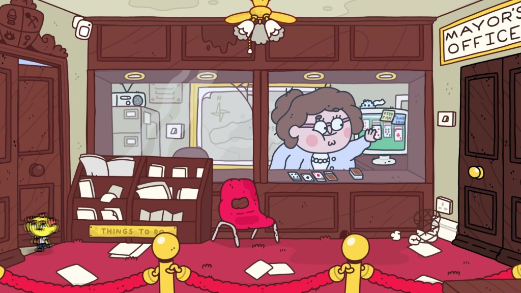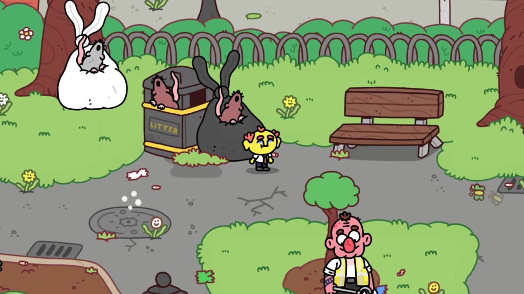TGYH has everything that you would see in a Saturday morning cartoon. Hand-drawn animations mixed with such bold colors make the game really pop. There is also a bunch of little details that really show how much love was put into the game. For instance, if you smack something to interact with it is usually pretty unique. Smack the trash can, it crumbles, smack a bag and a rat comes out, smack the sleeping park man and he wakes up at least four different ways.