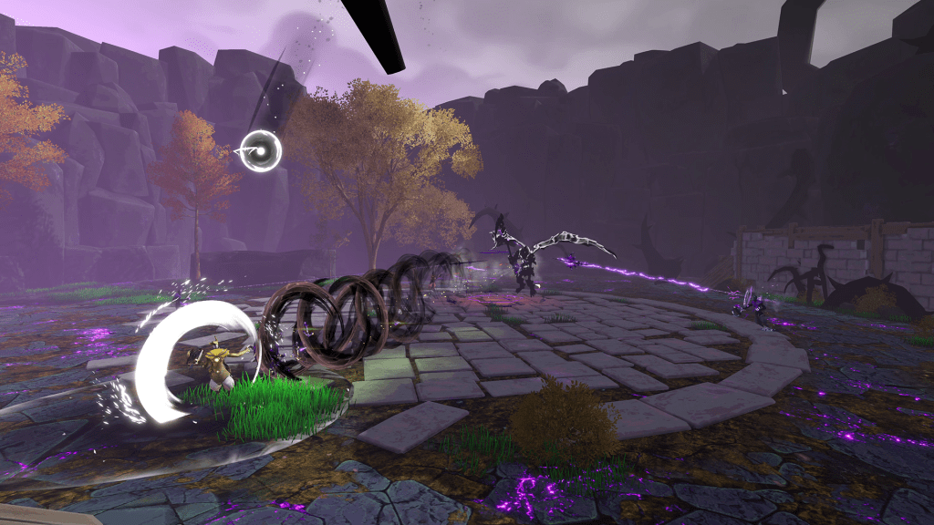 Each chapter is boiled down to a series of wave-based missions. There are waves of enemies coming at you and when defeated rewards are granted that buff the efficiency of the player. In the beginning, players have a choice of an upgrade that the enemies will obtain. Things like faster walking, more defense, damage upgrades, and even a zombie that emerges from the dead bad guy can be chosen. A portal spawns in a random section of the area that drops in a bunch of themed enemies. Enemies like a giant pumpkin man, zombies, bears, and other gross-looking baddies come out of these portals depending on which book is chosen. After the bar at the top is filled, end-of-round rewards are doled out. Things like damage buffs, specific attack buffs (to primary, secondary, and dash) and a slew of other upgrades can be chosen out of three scrolls (or six on occasion).