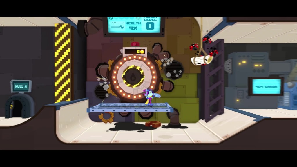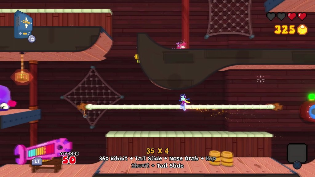 Seafrog facilitates its core gameplay by introducing a “skate park” -like level system where it takes full advantage of skateboarding and platforming. Levels are pretty large and incorporate a lot of ramps, half-pipes, and rails to do tricks on, all the while the main objective of getting the ship fixed by latching your tongue onto pipes to turn them on to open up doors to more levels to do more of the same.