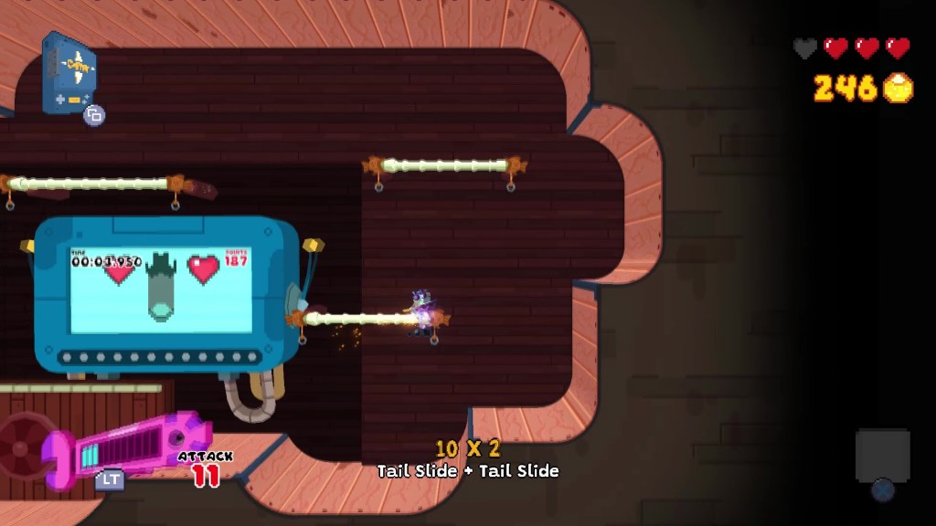 The Seafrog demo introduces the main meat of the gameplay; traversal. It is understood immediately that Seafrog is slow but when they are on their wrench skateboard you are incredibly mobile. The game then introduces the “auto trick system” and the boost meter. Tricks are done while in the air and grinding rails and provide points to fill up the boost meter that makes you go fast with the press of a button, which gets you to areas that you couldn’t reach without the boost, mostly for collecting out of the way “Golden Barnacles” which is the prime collectible fuel to progress the narrative.
