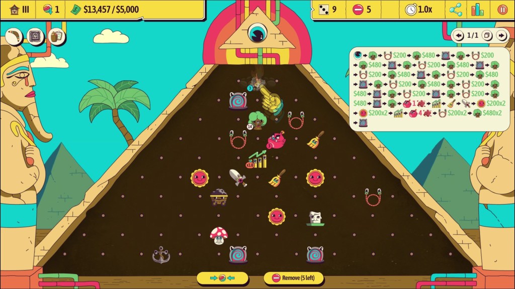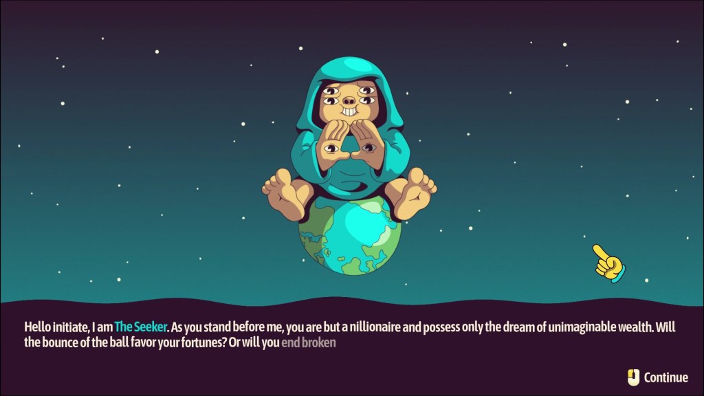 There are Gods, and they need to be pleased, and the only way to appease them is through playing a game that translates into money. At the beginning of each round, the player is given a money threshold that they have to overcome with a set number of pachinko balls in the top left corner, along with the current money they have. It looks like there are three sections to play through. Each has a God and a certain stipulation attached like ager pegs age faster or certain pegs lose value.