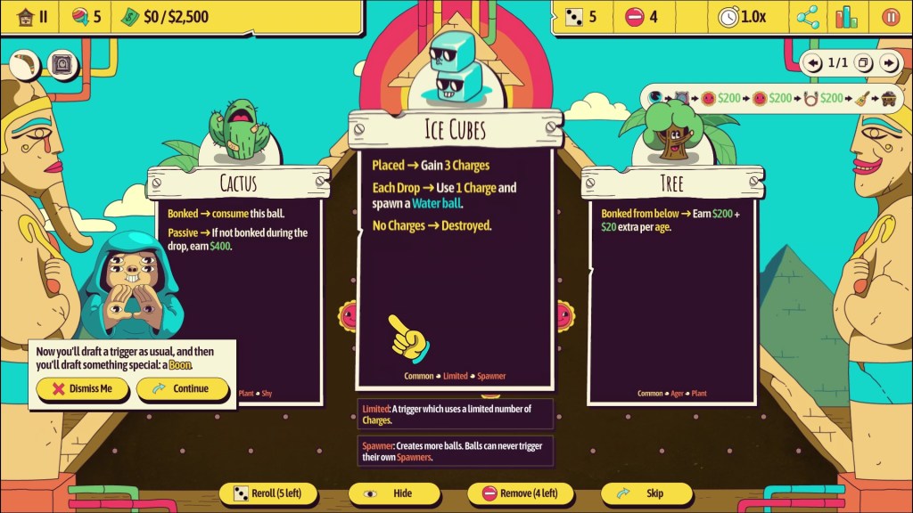 Ballionaire is incredibly straightforward. You have a pre-determined board with some already placed pegs that have some goofy abilities: a jump rope that gives you money and bounces the ball upward, a standard bouncy one, and maybe a tree that, if hit from the bottom, then you’ll money for each age counter on it. After each throw, you are given a choice between three new pegs to place on your board, some of which can be combined to make interesting combinations.