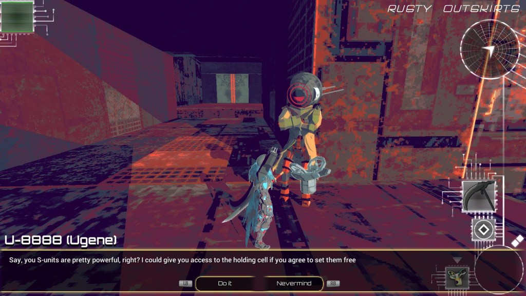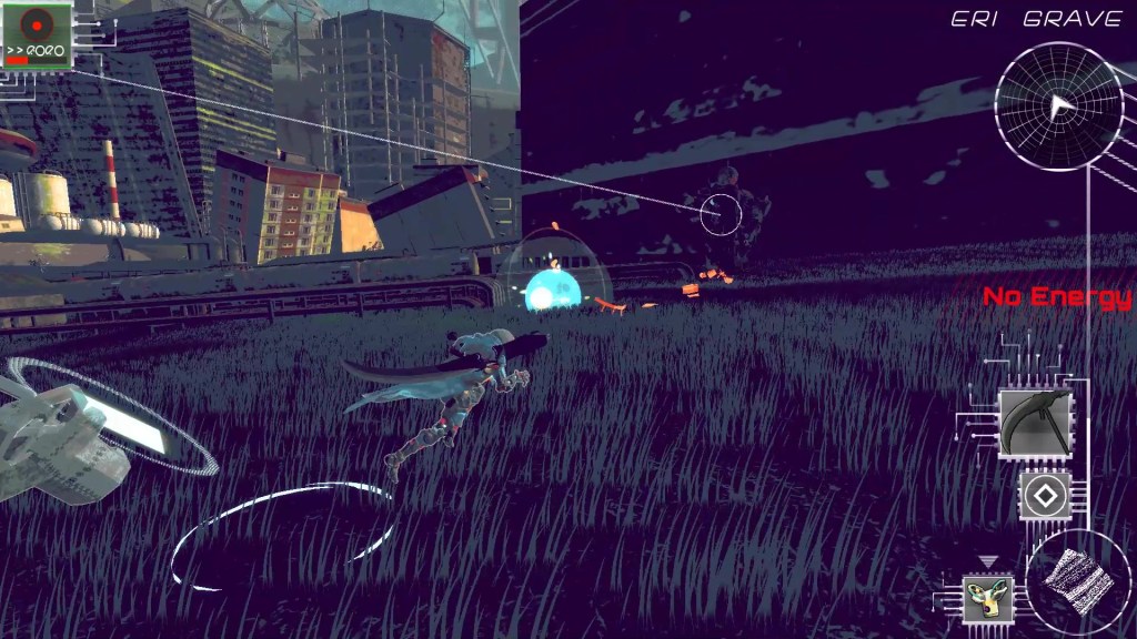 V. A Proxy is a looker, but I cannot really tell you if I really like it because I was moving so fast all the time that areas were gone in the blink of an eye. The game looks like a PS2 game with a super grainy backdrop. The environment is beautiful, with overgrown skyscrapers and highways. I can’t forget the skybox that has an enormous red eye and is constantly looking. It’s all great.