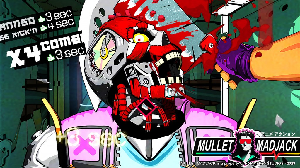 It is obvious from the look of the game that HAMMER95 was hinged on making a video game that was inspired by 80-90’s anime. When I first booted up Mullet Mad Jack the synth-wave was bumping my desk and the neon colors were pushing my monitor to the max. The cutscenes and character models remind me of any 90s anime that I ever watched. I understand the warning at the game’s opening about the bright flashing lights because Mullet Mad Jack goes crazy on the robot gore, flashing lights, and bright colors.
