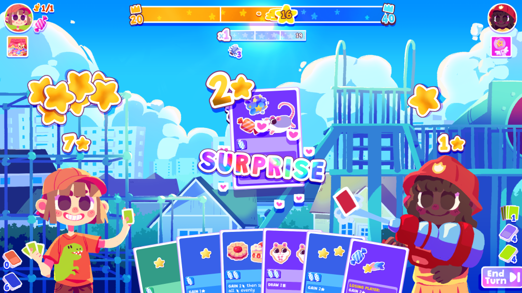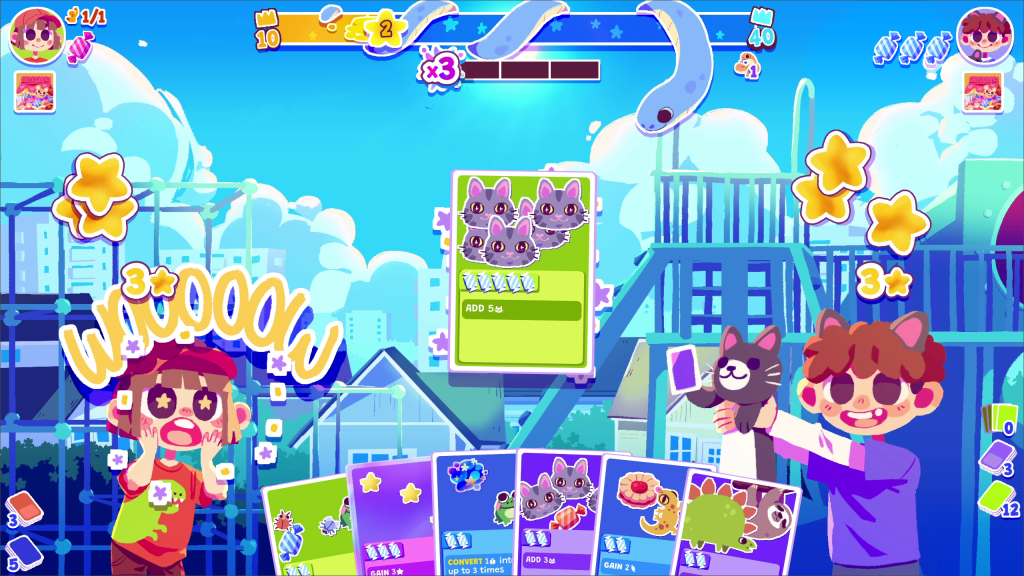 Though the gameplay seems simple, it is actually deceiving. Draw three cards plus one, and on the player’s turn, choose whether you want another card or a candy, or the energy to play cards. The goal of the playground game is to play cards to get stars, get more stars than the other player, and win. After a whole turn order, the two players’ stars collide, and the winner splits the difference (5-4=1 and so on and so forth). Stars remain until negated by the opposing player. Get enough stars to push the bar over the top, and you win! Sort of like a more fun tug-of-war. All while some jams are being played in the background.
