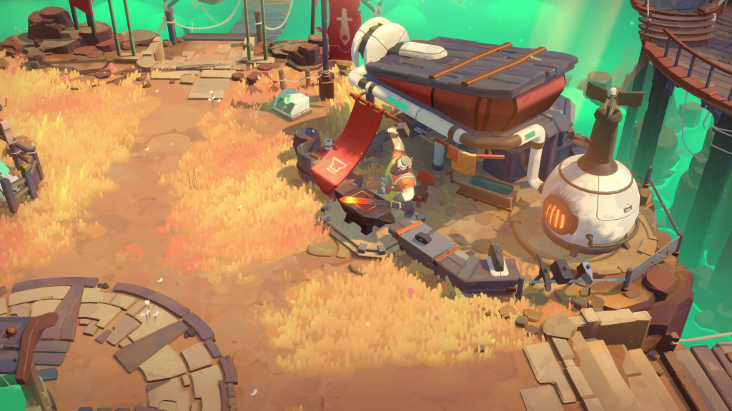 Instead of the over-the-top pixelated style that I came to absolutely love, Moonlighter 2 takes on an isometric 3D style that I was hesitant about like but after playing the game for three hours, I grew to really like it. The desert biome is beautiful with its winding, rocky pathways. I like the look of the bad guys in this area too; they are like humanoid bugs that are goofy, but also serious-looking. The town in which your shop is located really nails the rustic, but also futuristic fantasy atmosphere. There is a portal to other worlds at the edge of town, but there is also a blacksmith with a regular hammer and a potion maker with a simple cauldron.