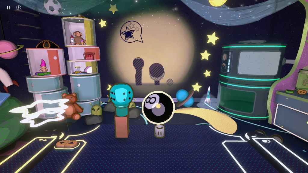 Gameplay is simple to understand: There is a light on the wall, pick up items, rotate them, and place them on a table to match the shadows on the walls. Loads of objects can be picked up and fiddled with, and you can rotate them in every possible way. Picking up, rotating, and placing objects is easy and becomes second nature almost immediately. Can’t figure it out? Projected Dreams gives the player the option to look for the answer. The difficulty curve can sometimes spike upwards, so being able to get a little hint is nice.