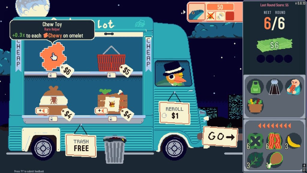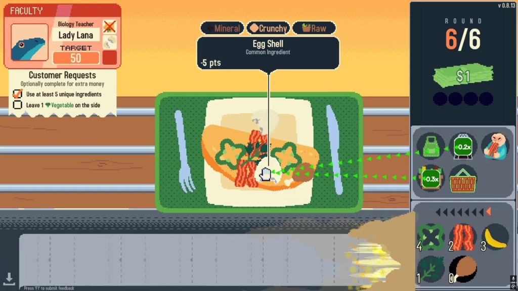 An ID card is slapped onto the screen, a cafeteria tray is slid in front of you, and it is time to make the best possible omelet with the ingredients that you have. The conveyor belt on the bottom feeds random ingredients through, and you have the choice of one, then the rest get trashed. After 5 rounds points are added up, and you either pass or fail. Pass and get some money, and move onto the shopping section to buy more ingredients or passive buffs that help you along the way with the food deck you are trying to make.