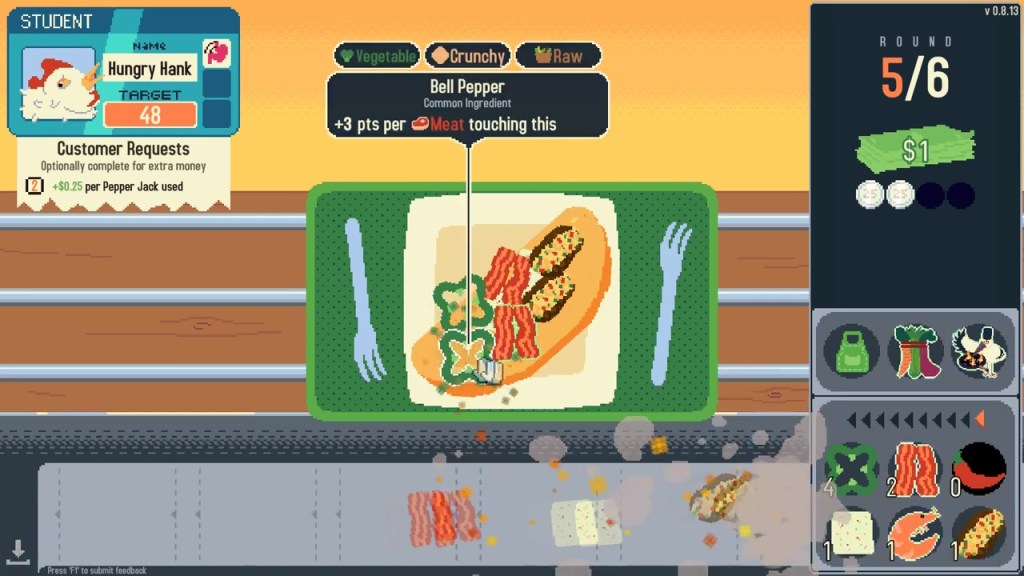 Ingredients have a type, whether it be crunchy, baked, sweet, etc. They also have abilities attached to them. It may be like the green pepper that gains more points the more meat that it touches, or the pepper jack cheese, where it gives you a multiplier based on what is covered by it. After all is said and done, the player may have a coconut, green pepper, bacon, and cupcake omelet to give someone.