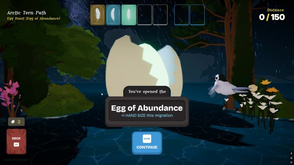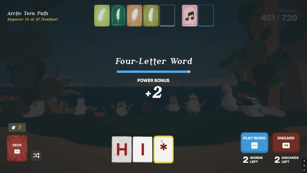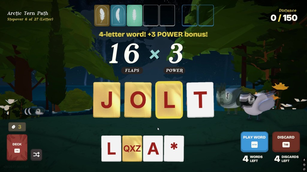 I like the discoverable factor in deck builders like Balatro because it makes you feel like you outsmarted the game, but the game wants you to think outside the box and exploit those combos. It was in a matter of minutes that I pieced together noticeable combos to get a significant load of points. Now, my vocabulary is not that great, but it was enough to get me through a migration path or two. As you progress down a path, the game becomes more difficult, so being able to maximize the points is key to winning. There were moments during the first migratory path that I was exceeding the mandated points simply by spelling the word S-E-E. It was fantastic.