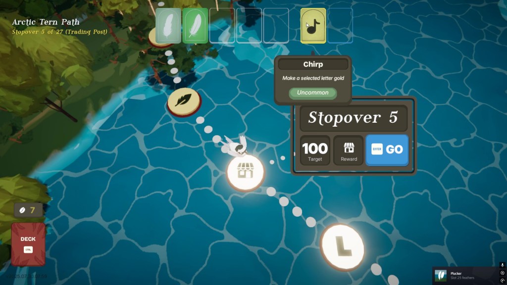 The gameplay loop is simple to understand: Spell words, get points, and abuse the multiplier as much as possible. The migration path is clear, with a set amount of spaces to complete and a set number of points to win the section. Along the way, there will be branching paths to permanent upgrades to help your birds along the way, like more words or discards in each section.