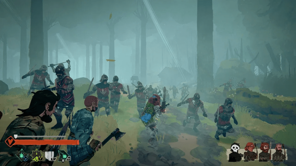 Pick your own leader and warriors, who have special abilities and their own modifiers, before heading out. Once out, there is a map with icons that represent currency rewarded, modifiers, shops, boss fights, and random events that roguelikes have. The player has 4 abilities: A dodge (on a timer), light and heavy attacks, and a block. You can chain attacks to deal massive damage and block to prevent, until your stamina breaks.